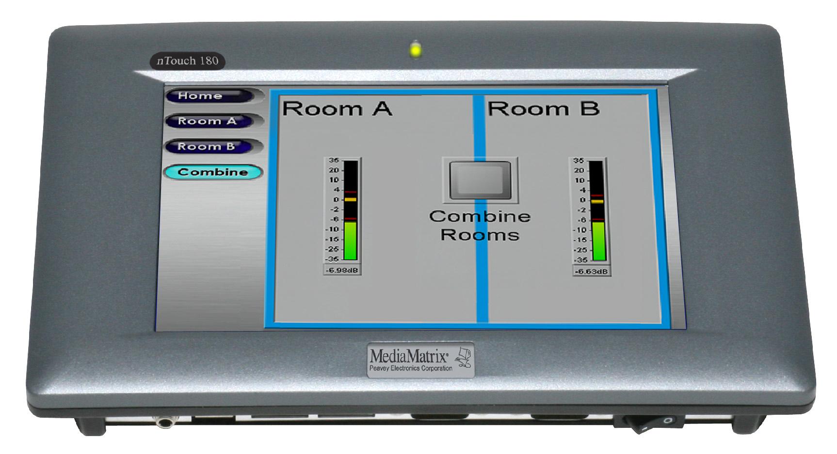 媒体矩阵nTouch 180 是一个用来控制媒体矩阵系统的触摸屏控制面板。运行NWare Kiosk 软件的nTouch 180允许用户控制一个用NWare设计的工程。它与掌管工程和媒体文件的NION或者nControl协调工作。